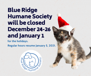 All locations of the Blue Ridge Humane Society be closed December 24-26 and January 1 for the holidays.