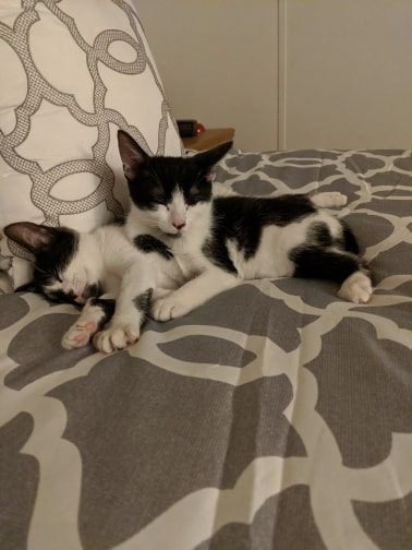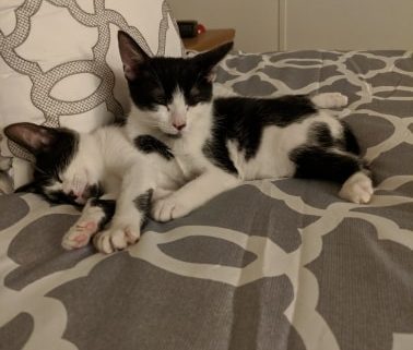 These beautiful cow-kittens were the last two of their litter, and we were holding out hope that an adopter would want to keep them together. After Heidi recently lost her 16 year old cat, she was hoping a pair of kittens would help her heartbroken family heal. We were so happy when they chose Kelby and Odeletta, who for some reason had waited weeks to be adopted.