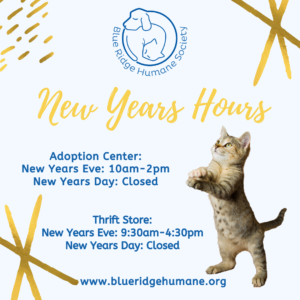 Happy New Year everyone! The Adoption Center and Thrift Store will both be closed on New Years Day and will re-open with regular hours on Thursday, January 2!